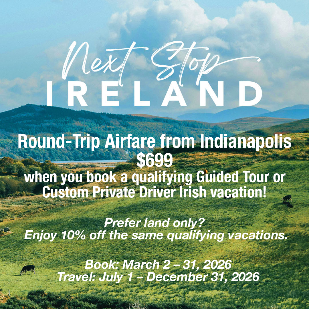 *March 2026 Promotional Terms & Conditions: Airfare and land-only promotions apply to the following guided tours: Best of Ireland South, Evergreen Ireland North, Evergreen Ireland South, Ireland South Daytripper, Ireland Walking & Hiking: Cork to Kerry, Ireland Walking & Hiking: The Northern Coast, Ireland’s Wild Atlantic Way, Irish Adventure, Irish Classic, Irish Gold, Irish Legends, Irish Odyssey, Irish Spirit, Irish Supreme, Jewels of Ireland, Mystical Ireland, Southern Gems, Taste of Ireland, The Irish Pub Tour, or qualifying Private Driver vacations of $4,999 or more per person, when booked March 2–31, 2026, for travel July 1–December 31, 2026. Airfare Promotion: Contact Geist Travel Planners, LLC to book; offer cannot be booked online. Round-trip Ireland airfare to Dublin or Shannon includes all taxes/fees and is valid from select U.S. gateways for new bookings made March 2–31, 2026, in conjunction with the eligible tours or qualifying Private Driver vacations within Ireland only, departing July 1–December 31, 2026. No blackout dates. Air prices are per person, economy class. Reference promo code: MARCH499 for $499 economy airfare from NYC/Newark, Boston, and Philadelphia; MARCH699 for $699 economy airfare from Hartford, Washington, DC, Chicago, Cleveland, Orlando, Minneapolis–St. Paul, Indianapolis, Nashville, Raleigh–Durham, Pittsburgh, and other Northeast/Mid-Atlantic and Upper Midwest/Plains gateways; or MARCH899 for $899 economy airfare from Los Angeles, San Francisco, Seattle, Denver, and other gateways outside the Northeast/Mid-Atlantic and Upper Midwest/Plains regions. Airline seats are limited and subject to capacity control. Offer may not be available on all travel dates or from all gateways; other airline ticket promotions and savings may apply. Full payment for air is due at booking. Airfare must be purchased through CIE Tours, is nonrefundable and non-commissionable, and is subject to airline-imposed change penalties starting at $350 per ticket plus any fare difference at re-ticketing. Baggage fees may apply; see https://bags.amadeus.com for details. Land-only Promotion: Save 10% on the land-only portion of eligible guided tours and qualifying Private Driver vacations listed above when booked March 2–31, 2026, for travel July 1–December 31, 2026. Reference promo code: MARCHLAND. Land-only offer may be booked by calling Geist Travel Planner, LLC. General Terms & Conditions: A $250 per person non-refundable tour deposit is required within five days of booking for land-only guided tours, or at the time of booking for Private Driver vacations or bookings made with the airfare promotion. Additional Private Driver deposits may be required due to third-party requirements for specialty visits, hotels, or destinations. Not combinable with other CIE Tours offers or discounts except the repeat guest incentive, and not available for group travel or self-drive itineraries. Offer may be withdrawn at any time, is subject to availability, and other restrictions may apply. Advertised tour prices are per person, land only, based on double occupancy, and vary by departure date. CIE Tours standard Terms & Conditions apply. CST #202 1285-50.